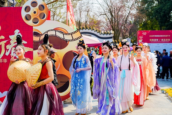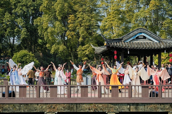 活动期间,望丛祠景区化身为一座“可游、可感、可互动”的古蜀文化空间。“望帝”教民农桑、“丛帝”治水开山、“花神”翩翩起舞、“杜鹃鸟”引吭高歌……20余名NPC沿景区动线开展巡游,并在各主题片区上演情境演绎和舞蹈快闪,邀请游客即兴对歌、互动合影,现场气氛热烈。张女士带着家人参与其中,连连称赞:“孩子边玩边学到了望丛二帝的故事,特别有意义,真是有文化、有年味、有创意。”