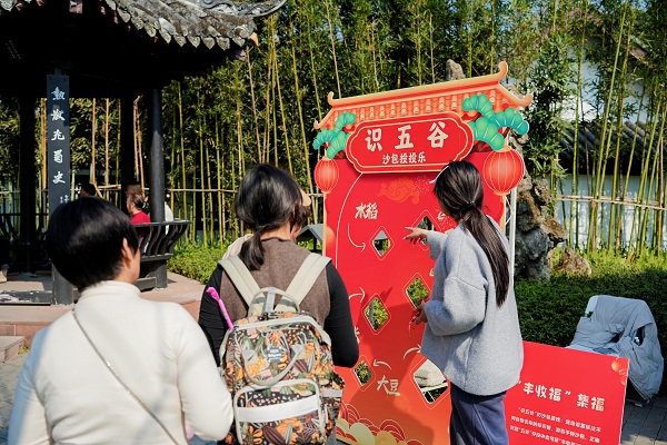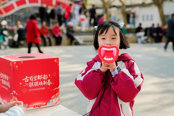 围绕“勤劳稼穑·五谷丰登”“凿山导江·水润天府”“礼乐歌咏·匠心非遗”“春满鹃城·马上嗨郫”四大主题,景区内布局了多个沉浸式互动体验点位。游客通过参与民俗小游戏,集齐四枚专属福章,即可兑换马年主题限定礼品。寻福打卡机制为游园增添了一份寻宝般的仪式感,让传统文化在步步有景、处处可玩的互动氛围中“活起来”“潮起来”,悄然浸润人心,进一步增进了市民游客对本土文化的认同与热爱。